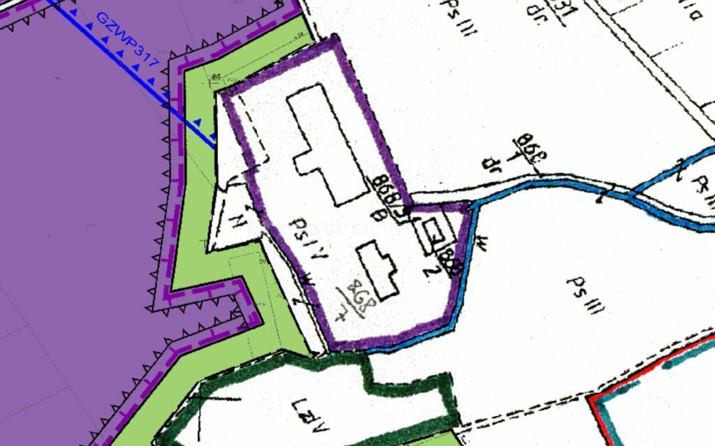 Działka 868/7: ok. 80% tereny przemysłu, baz i magazynów (kolor fioletowy na planie), ok. 20% trwałe użytki zielone.